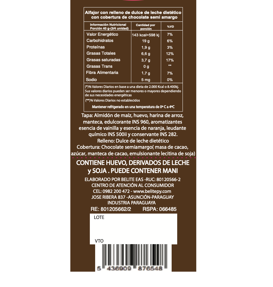 ALFAJOR RELLENO DE DULCE DE LECHE DIET CON COBERTURA DE CHOCOLATE NEGRO SEMIAMARGO